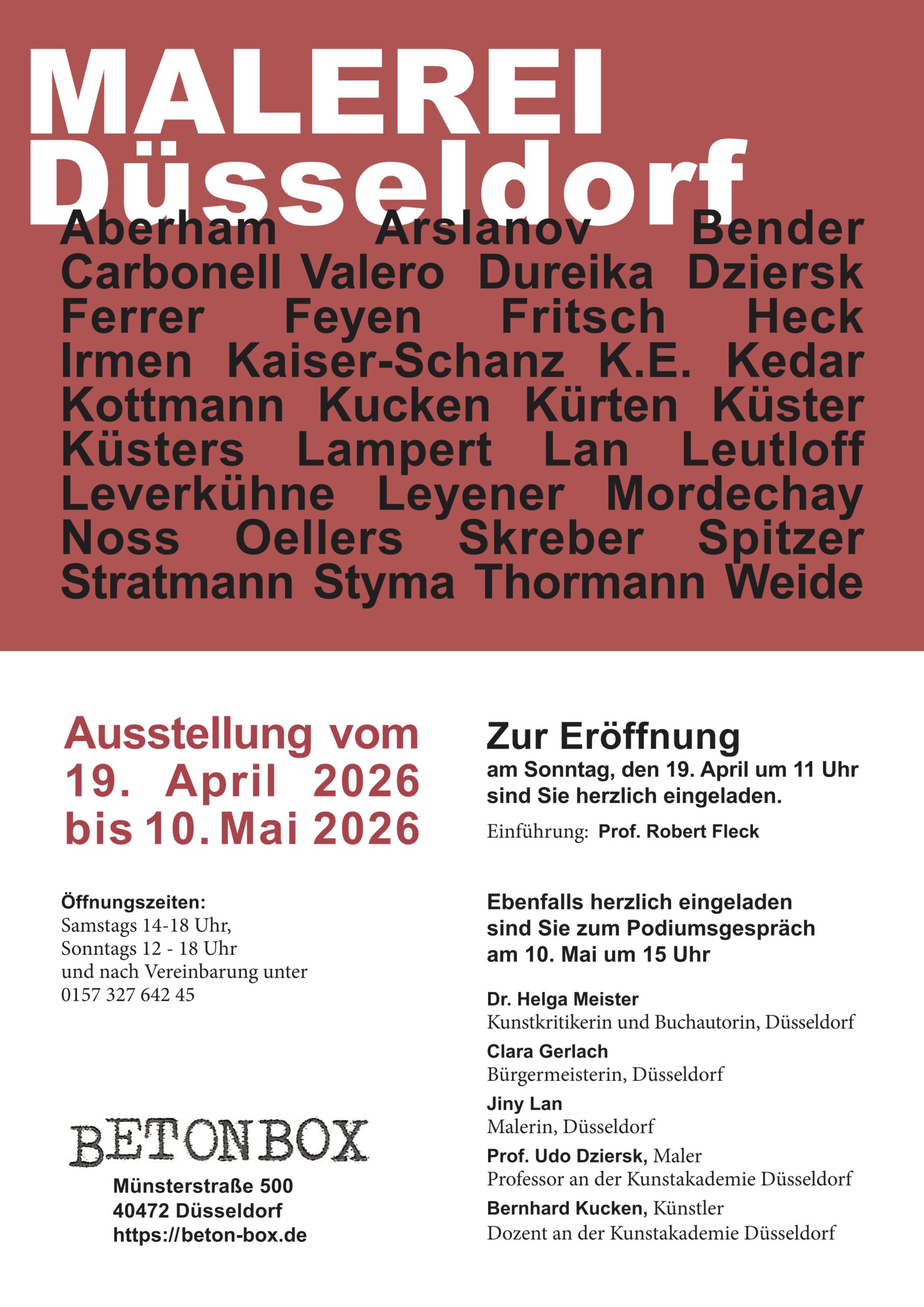 Laura Aberham, Rimma Arslanov, Andrea Bender, Carlota Carbonell Valero, Andrei Dureika, Udo Dziersk, Veit Ferrer, Harald Feyen, Kati Heck, Katie Irmen, Gabi Kaiser-Schanz, Tamara K.E., Dvir Cohen-Kedar, Markus Kottmann, Bernhard Kucken, Stefan Kürten, Andrea Küster, Franz Küsters, Kirsten Lampert, Jiny Lan, Vera Leutloff, Silke Leverkühne, Annette Leyener, Roy Mordechay, Stefan Noss, Edith Oellers, Dirk Skreber, Rene Spitzer, Veit Johannes Stratmann, Astrid Styma, Christoph Thormann, Gabriele Weide